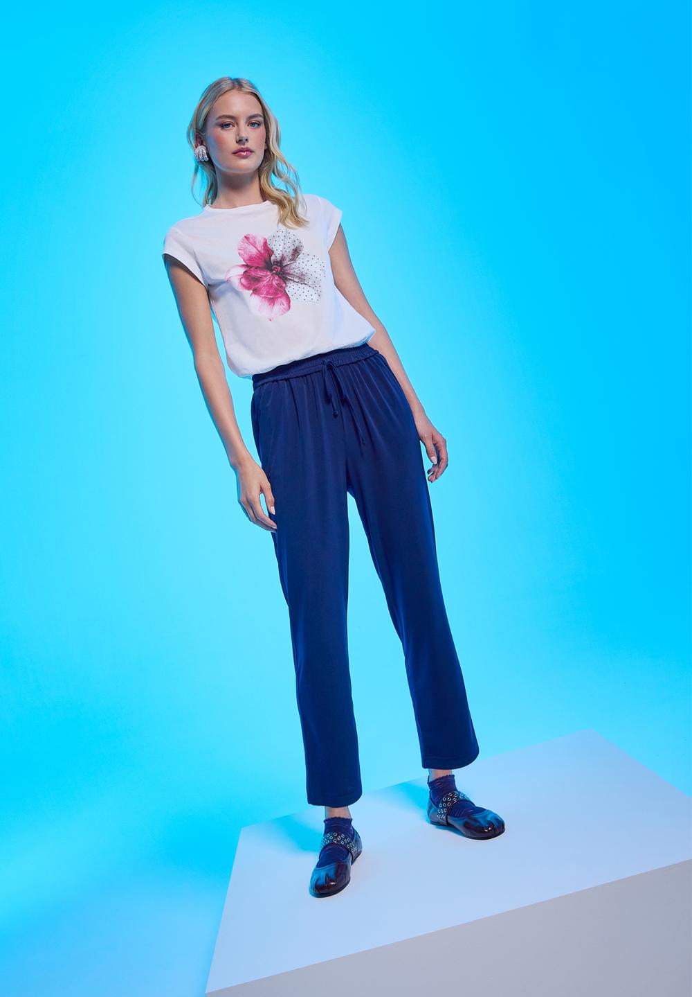 T-shirt moda con cotone. Scollo tondo e manica corta. Stampa colorata sul fronte